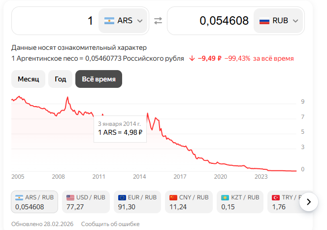 >Аргентина 1700$ Вот с этого особой ор нахуй. Аргентинский песо в 2014 году стоит 5-7рублей. Аргентинский песо сейчас стоит 5копеек.