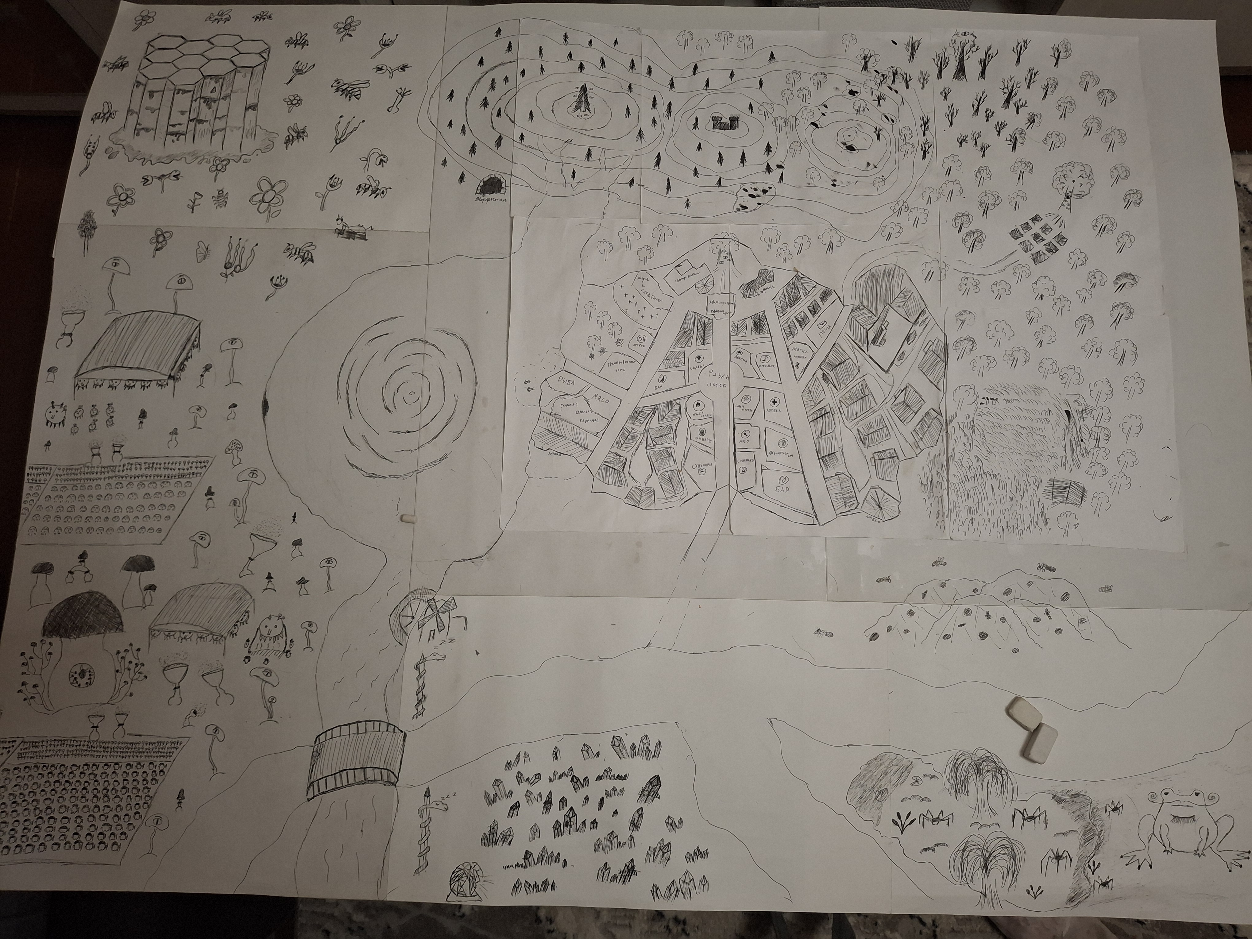 Что у нас имеется: город РязанОмск, К востоку от него - лес с друидами, К северо-востоку - демонический лес, или что то вроде. К северу горы(схематично, как на географических картах, я хз просто, как их рисовать, помним про рукожопость) и попытка стилизовать черные пятна от потекшей ручки под руду, ну и еще в пещерах дворфы должны быть От гор на западе можно увидеть, как образуется река, переходящая в озеро с водоворотом в центре, а потом снова в реку. Что в водовороте - хрен знает, "Раскроем в будущих кампаниях" Еще западнее - луг с гигантскими растениями, часть из которых хищные(Да, биологически хищ.растения произрастают на бедных почвах, но моим друзьям нужны битвы на пустом месте) и гигантский улей. Часть пчел оттуда я планирую сделать как один из типов врагов в hollow knight, там, если знаете, были пчелы, которые при атаке наизнанку выворачивались и жало свое открывали, но я отошел от темы Южнее улья находится грибное королевство. Или ЧВК. Суть в том, что сами грибы как мирные жители свое сознание перенесли в грибницу и на поверхности мы можем их видеть лишь частично(грибы с глазами на 4 фотке). Живет, процветает и зарабатывает это государство за счет выращивания и продажи грибных армий на плантациях, которые можно увидеть на 4 фото. Представляет из себя боевая единица белый гриб телосложения "Бочка на ножках" с копьем в руке. Что то типа авиации тоже есть: грибная оболочка со спорами внутри, летает по принципу воздушного шара, дизайн взял со Споруна из того же холоу кнайта. Также есть болото к югу от города, там обитают травоядные 8-лапые существа на очень высоких и тонких ногах, ну и жаба. Волшебная жаба с мексиканскими усами