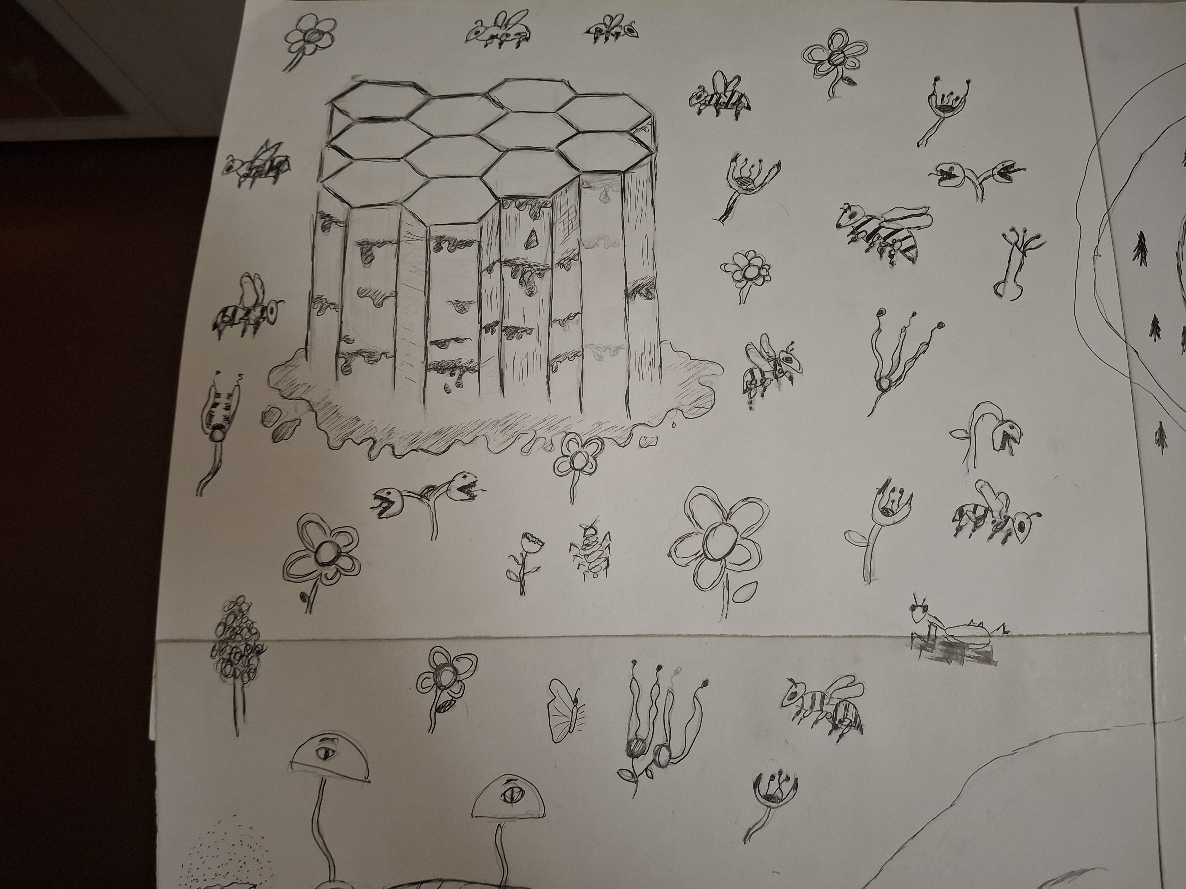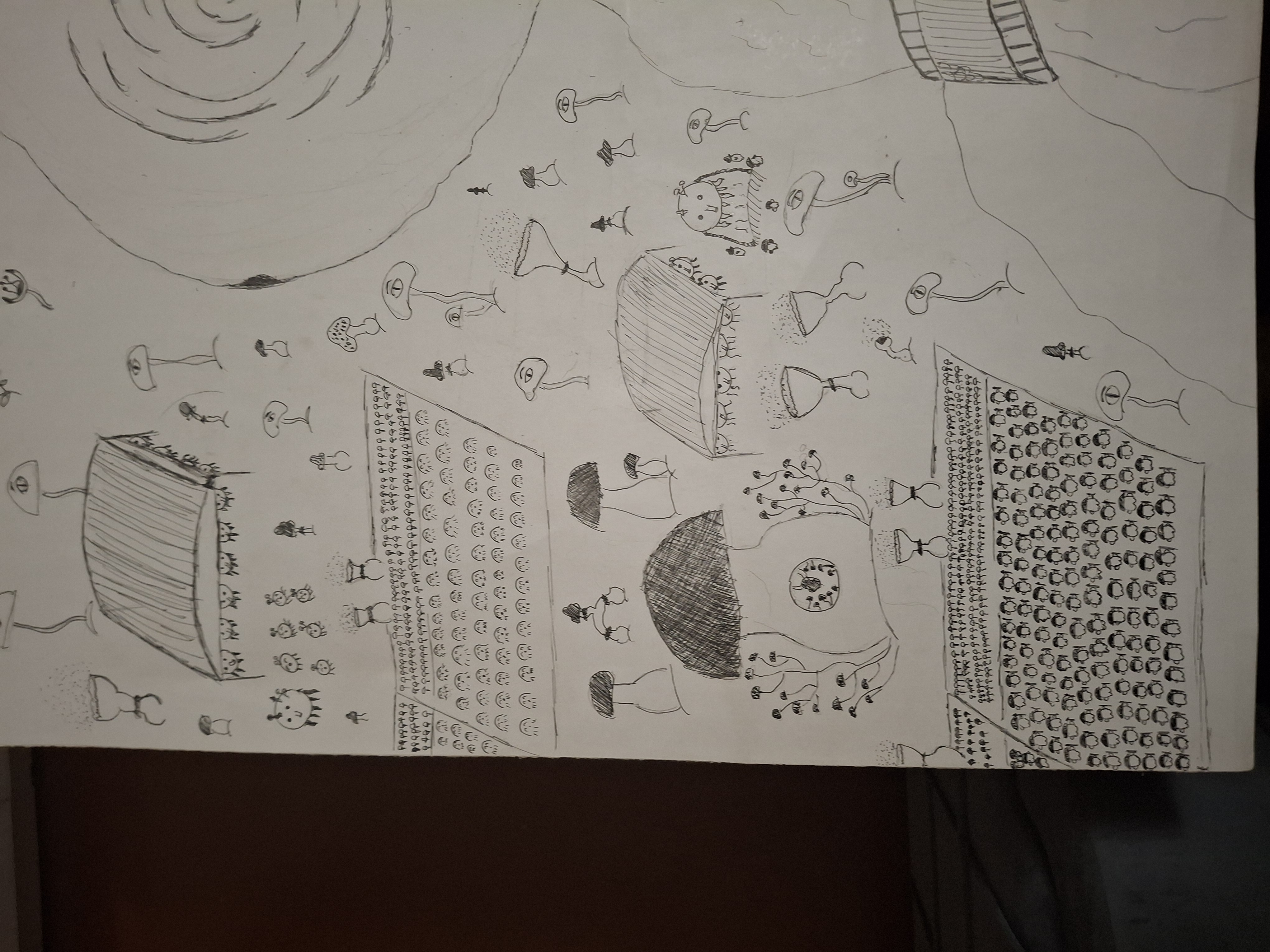 Что у нас имеется: город РязанОмск, К востоку от него - лес с друидами, К северо-востоку - демонический лес, или что то вроде. К северу горы(схематично, как на географических картах, я хз просто, как их рисовать, помним про рукожопость) и попытка стилизовать черные пятна от потекшей ручки под руду, ну и еще в пещерах дворфы должны быть От гор на западе можно увидеть, как образуется река, переходящая в озеро с водоворотом в центре, а потом снова в реку. Что в водовороте - хрен знает, "Раскроем в будущих кампаниях" Еще западнее - луг с гигантскими растениями, часть из которых хищные(Да, биологически хищ.растения произрастают на бедных почвах, но моим друзьям нужны битвы на пустом месте) и гигантский улей. Часть пчел оттуда я планирую сделать как один из типов врагов в hollow knight, там, если знаете, были пчелы, которые при атаке наизнанку выворачивались и жало свое открывали, но я отошел от темы Южнее улья находится грибное королевство. Или ЧВК. Суть в том, что сами грибы как мирные жители свое сознание перенесли в грибницу и на поверхности мы можем их видеть лишь частично(грибы с глазами на 4 фотке). Живет, процветает и зарабатывает это государство за счет выращивания и продажи грибных армий на плантациях, которые можно увидеть на 4 фото. Представляет из себя боевая единица белый гриб телосложения "Бочка на ножках" с копьем в руке. Что то типа авиации тоже есть: грибная оболочка со спорами внутри, летает по принципу воздушного шара, дизайн взял со Споруна из того же холоу кнайта. Также есть болото к югу от города, там обитают травоядные 8-лапые существа на очень высоких и тонких ногах, ну и жаба. Волшебная жаба с мексиканскими усами