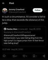 >>1628972 Ну, так вот, я к тому, что как ты это себе представляешь? Ты же не можешь шесть секунд лететь вверх, а потом ещё шесть секунд лететь вниз. Многовато для прыжка!