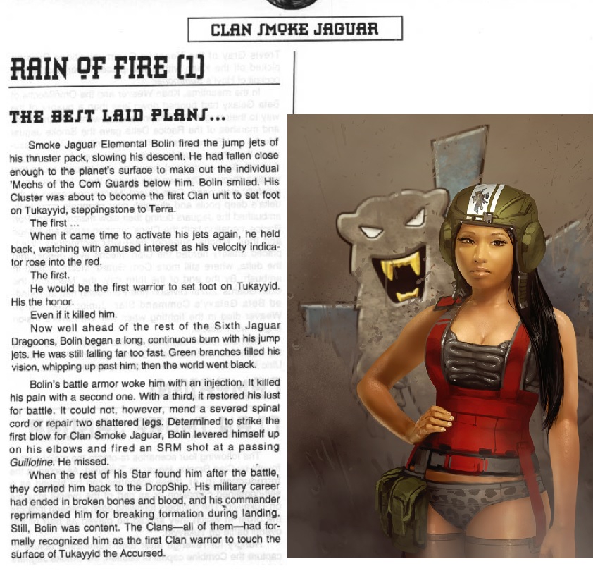 >>1647268 >Что ты несешь? Какие протомехи в соламе? Первых пилотов протомехов набирали из отбракованных и соламных пилотов ВВС, потому что им нечего было терять от установки EI. >На Охотнице соламой были спившиеся инвалиды на говне из говн уровня 3НВ. >ProtoMechs achieved their baptism of fire during the Battle of Huntress, which was also when Smoke Jaguar Khan Lincoln Osis first learned of the program. His outrage at having been uninformed about the secret project was tempered by his Clan's dire needs and the good performance of the ProtoMechs against desperate odds. Although the battle was ultimately lost, the ProtoMech's debut could not be ignored by the other Clans. TRO 3060/3067