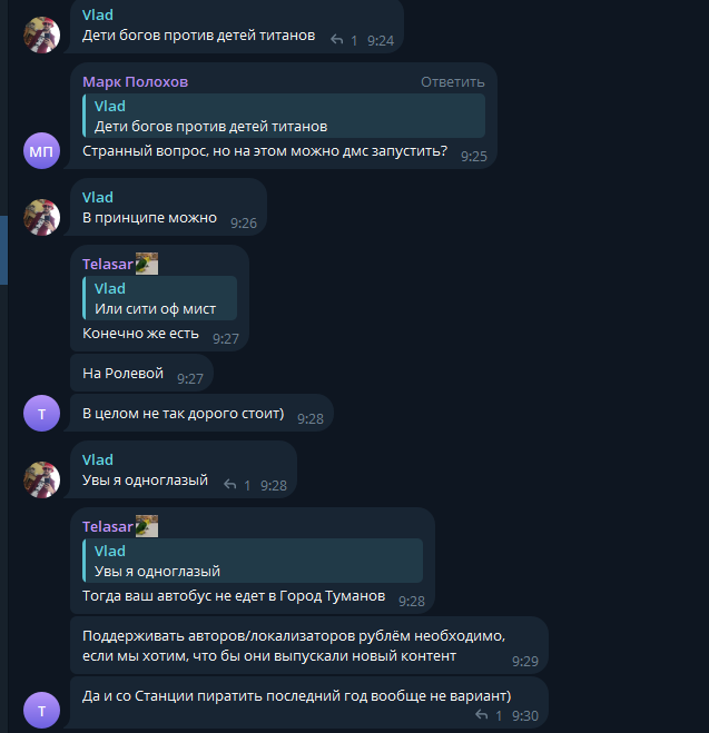 >>1627188 >ссылочка на тело Это видео вообще-то было явной шуткой, этого не скрывал ни автор, ни студия. >После того как книшко почитают и выскажутся/высрутся не заинтерисованые в ее продаже люди. Это правильно. Но рецензии на саму игру в сети есть, а вот на студийские переводы будет вряд ли. Их нет практически ни на какие переводы игр. А хорошо было бы почитать, емнип только водерасты пристально разбирают, за что им благодарность. Вот, например, пандора выпустила Приключения в Средиземье и Фэн "Значение Знаю" Шуй. Даже вроде пдф где-то гуляли, а отзывов на качество перевода нет.
