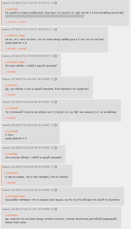 >>1624347 >>1624348 >Чтоб комфортно для себя водить дынду я прочитал Жаль, в Критикал ролл не знали, когда с пасфайдера переходили на пятерку, что им нужно еще 10 лет подождать, чтоб "комфортно" поиграть. А еще не надо переводить стрелки на днд, есть системы, в которых вообще один корбук, и видимо определенный комфорт они чувствуют раз не переходят на пасфайндер или днд.