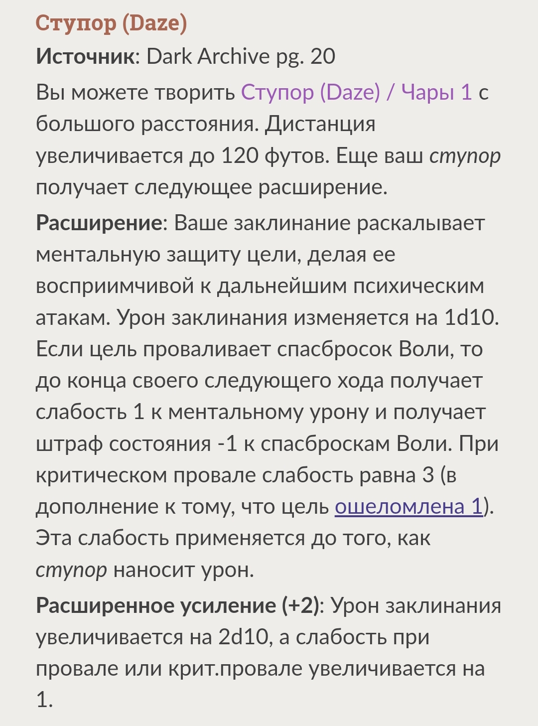 Кантрип экстрасенса ступор. Читаю эффекты по очереди. Сначала наношу урон, равный своей характеристике колдовства, только после цель совершает спасбросок. При расширении, пикрил, спасбросок проходит на дополнительный урон, 1к10, при провале 1к10 + мод. колдовства. Я все правильно понял? Или весь итоговый урон изменяется на 1к10? 3) Наследие кукла имеет признак конструкт. Когда ОЗ конструктов опускается до 0, существо-конструкт уничтожено. Это значит, что механика бросков кубиков для стабилизации, состояния ранен/при смерти, не будут играть роли? Играя за куклу, с 0 оз я сразу умираю?