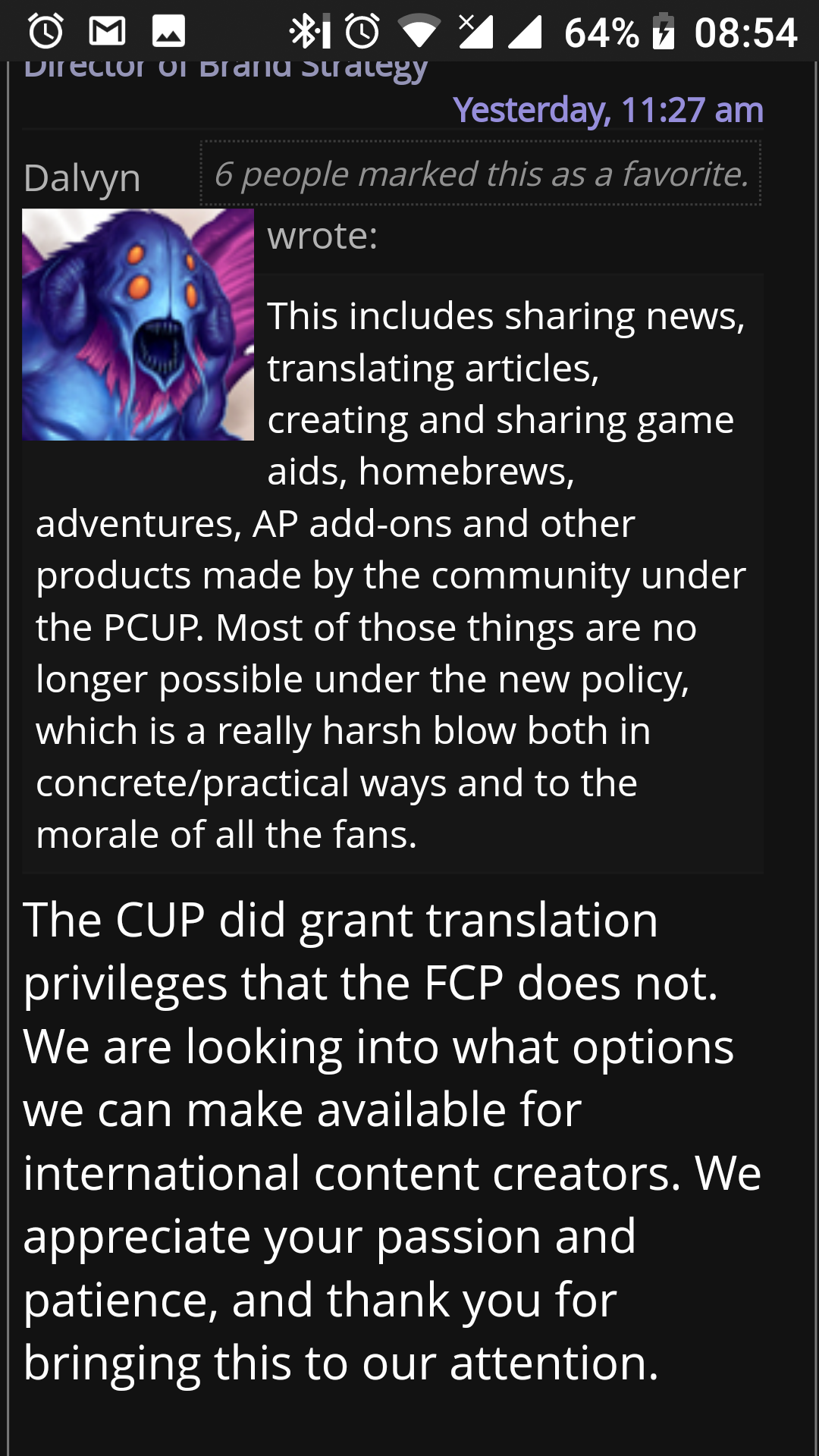 Жосенько история с ОГЛ теперь со стороны пайзо ебет контентмейкеров paizo.com/community/blog/v5748dyo6vh12?New-and-Revised-Licenses С одной стороны их можно понять, с другой, от того как сформулировано юридически, могут позакрывать кучу онлайн сайтов с инфой, типа нельзя мешать старый и новый контент. а один чел разводит панику что даже упоминать классических неписей на форуме будет нарушать новую лицензию упоминанием огл.