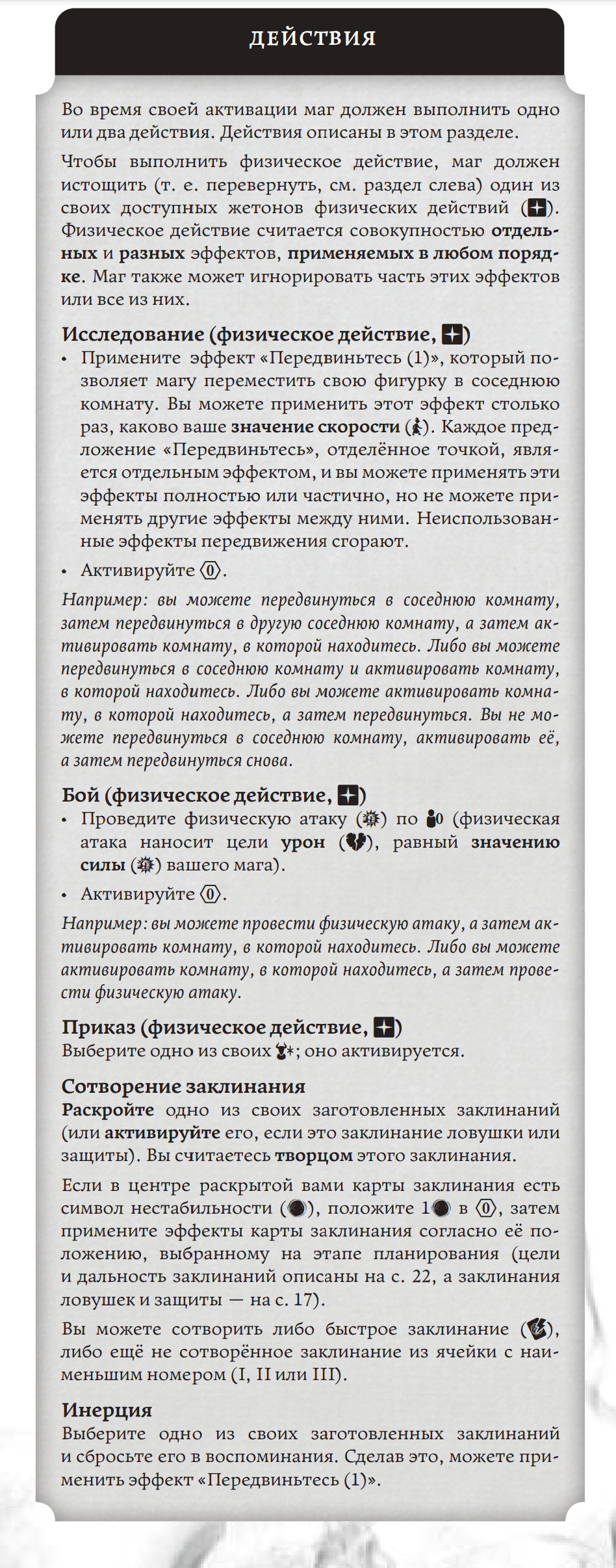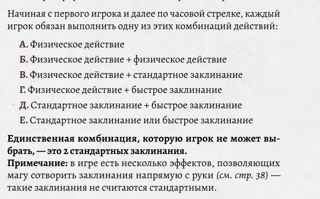 Не понел по этому описанию, какие два действия я могу сделать за активацию? Четко прописано только про сотворение двух заклинаний за активацию. То есть вторым действием может быть только активация быстрого заклинания? Или можно сделать два физических действия за активацию? Или физическое действие и заклинание (не только быстрое)? А инерция может быть вторым?А две инерции за активацию можно использовать? (Не знаю зачем, ещё не играл)