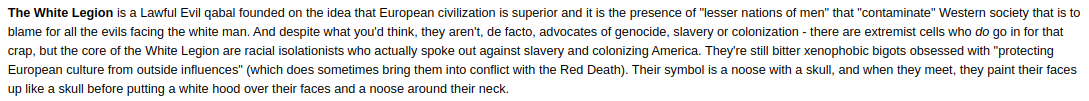 Но если ты хочешь сыграть в эту игру - окей. >Вхите лиджен Если бы я был чуточку потупее-помоложе, я бы сказал что тут "с больной головы на здоровую". Потому что сраные европеяки для Куклуксклановца, с которых списан Вит Лиджен - такая же погань, как и факинговые ниггеры. Эта шпиёны из цереу, хотят разорить мою бедну страаану. Учитывая, что аффтар - американец же (если верить педди-викии), это смешно. Это примерно как если бы немец написал про Царскую Россию, где к власти пришёл Родзаевский и начал бы еврейские погромы, а потом и вовсе попёр бы на Рейх.