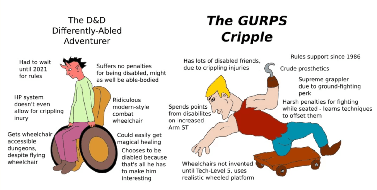 >>1634535 Если в игре лоу фэнтези, где самый крутой маг максимум фаерболл может скастовать, то протезы и кресла допустимы. Если у нас сеттинг типа Голариона, где вшивые крестьяне кастовать могут, то это очередной повесточный кал.