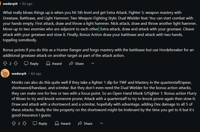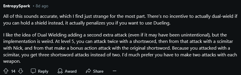 >>1635046 С одной стороны каждый раз перебирать "тут у нас бонусное действие, тут анусное" в падлу. С другой, иногда просыпается желание уровне на 5-7 не саморучно гоблу чистить, а загнать отряд рыл в 15. У пятерки немного не тот фокус.