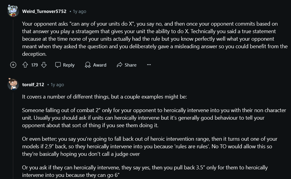 Например, в первом случае, на вопрос "дотянешься ли ты", противник отвечает "нет", а потом использует какую-то способность и теперь дотягивается. И что не так? Он в тот момент и не дотягивался, а вопрос был не про вообще любые потенциальные случаи в будущем. МтГ бы от такого запрета просто сломалась например. Или ваха, подразумевается игрой с полностью с открытой информацией как шахматы, без стелса, невидимости, скрытых способностей?