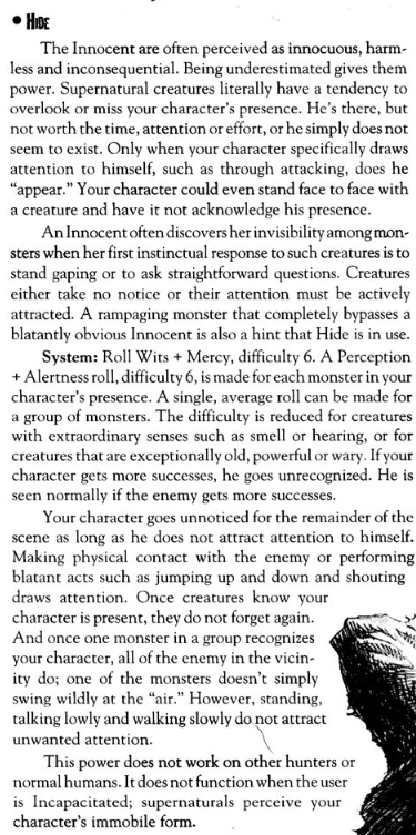 >>1634737 >Только на 6+ С первой точки. В пятерке с 3й. Правда именно с первой он получит инсайт не из воздуха, а если хоть иногда куда-то ходит и имеет шанс пересечься с кем-то из охотников в рамках одной локации. Что несложно, ведь охотникам придется самим подбираться поближе во время разведки. >The Storyteller may also use this power to see if the character perceives a threat и там дальше примеры. >Удачи с хантер-нет Вампирские охотники это, как правило, их личная подлинейка, а не Наделенные и уж точно не маги. И, кстати, хантер-нет дважды ломали. И если смотреть с точки зрения реализма, возможно взломов было куда больше, просто их не палили. Ну и вроде охотнику ничего не мешает туда зайти, если, скажем, он будет загулен или под доминированием. >И она тоже занимается Погромом, если чо При наличии на поле Технократии или других магов, охотников можно просто не брать в расчет. >информация сливается тем же темпларам Хористов Это откуда такая инфа? >базовые знания по вампирам города Ну, если вампиры города пиздят о своих делах, слугах и убежищах каждому встречному неонату, то да, это сработает.