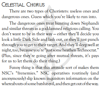 >>1634734 > кто-то с ауспексом Только на 6+ (и то на 6 нужно конкретная цель), контрится линейщиной, контрится магами, контрится хантерами, контрится истинной верой, контрится банальным дудосом (вместо отдельного действия по захвату одного неоната в одном городе идёт повсеместная охота. Привет Погрому, который как раз про это) >Auspex 6: Horoscopic Forecast: Gain a glimpse of the target's future >Auspex 9: Sight of the Oracle: Always know what is happening around you, gain visions of past and future events, and increase other supernatural senses >Ну или постоянно роющие что-то носферату что-то узнают Удачи с хантер-нет, закрытыми физически сетями, гипертекстовым фидонетом диджитал вебом адептов виртуальности, и прочими сходками в Умбре. лол. >Так это же Технократия, а не охотники И она тоже занимается Погромом, если чо. >было строго похуй и максимально поебать. Экчуалли нет. Вампиры НЕ первостепенная цель пока держат маскарад и не выходят за рамки дозволенного, однако на них не похуй и информация сливается тем же темпларам Хористов или Фламбо герметистов или потирам эвтанатои >Зачем? Затем что есть базовые знания по вампирам города у любого местного неоната, а дальше как повезёт.