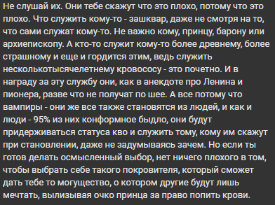 >>1634654 >как-то уже слишком близко к эджи-хуйне для снежинок Бляха, да любой вампир это снежинка. А в условиях их жизни (которая считай как жизнь в каком-нибудь картеле или мафии и не на привилегированной позиции, но помноженная на факт, что в ней состоят параноидальные монстры с постоянной угрозой срывания фляги от голода, а не бизнесмены с психопатическими чертами), эйджи-хуйня вообще не криминал.