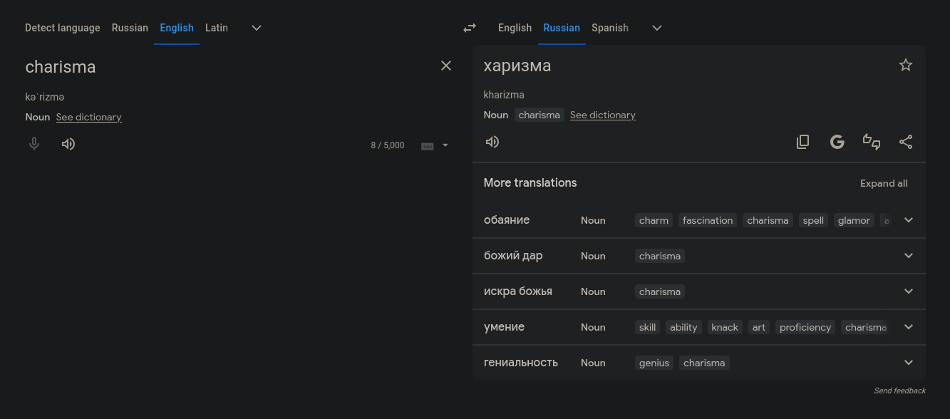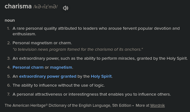 >>1646771 Просто Харизма - это не перевод, а использование слова, пришедшего из другого языка и получившего несколько иное значение, нежели оригинальное.