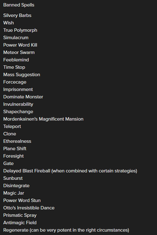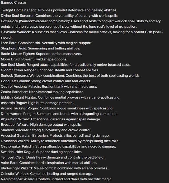 >>1644385 Какая-то шиза по большей части. Я понимаю там бан ааракокры или имбанутых архетипов из таши, но че такого в пхбшных подклассах и абсолютно безобидных рас типа лизардфолка или табакси, кроме разве что из эстетических соображений. А Wish я бы не банил, а либо сделал его одноразовым (как если бы сразу выпало меньше 33 на стограннике), либо сделал поиск этого заклинания целым квестом.