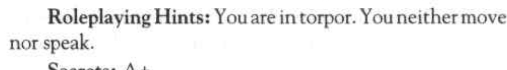 >>1646460 Игроки-смертные подвергаются воздействию Презенса? Ну опиши это так будто их внезапно накрыло чувством сильного доверия к говорящему. Все, что говорит собеседник, кажется им правильным и неоспоримым. Если вампир говорит что-то совсем в разрез убеждений или знаний игрока, скажи что они верят сказанному на эмоциональном уровне, но это доверие кажется им чрезмерным при рациональном анализе. У игроков в любом случае будет метазнание о том что происходит, если только ты не будешь делать броски за них в закрытую. Вопрос в том как они это отыграют.