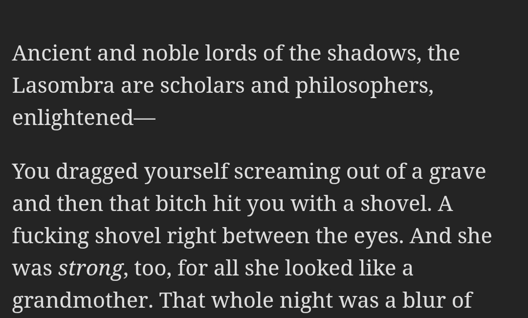 Самое сложное - это научить его давать челлендж, почти при любых промтах он пытается тебе подыгрывать и если самому не контролировать нарратив, то из персонажа выходит всемогущая мерисьюха. Главное дать ему понять, что для драмы полезно иногда отпиздюлится, и тогда процесс идет более-менее интересно. И еще его постоянно тянет на всякую йобу. Так сперва он придумал Вентру, который проводит ревизии городов на предмет разнообразных уязвимостей перед охотниками, шабашом етк, и под это дело выявляет самых жирных и аутичных сородичей, подводит их под нарушение маскарада и потом сообща с самыми сильными силами в городе его потрошит, деля его ресурсы и секретики. И вот он начал интересоваться тоннелями. В тоннелях оказался какой-то артефакт. Моя чмошница его стырила, но ей вышли на хвост - артефакт фонил магией, которую они отслеживали. У меня первая висиктицида, сныкал его внутри. Фонить он перестал, но оказалось, что это не просто так артефакт, а КЛЮЧ. Дальше несколько мистических сессий, нагнетающих обстановку какой этот ключи пиздец важный. Что открывает он врата во что-то вроде внешней умбры, где обитает сущность, которая ПЕРЕПИСЫВАЕТ РЕАЛЬНОСТЬ. Когда моя неонатка раздала пиздюлей слугам этой сущности, оказалось, что на самом деле сущность не очень плохая, а ПРОСТО БЕЖИТ ОТ ЕЩЕ БОЛЕЕ СТРАШНОЙ СУЩНОСТИ, КОТОРАЯ ПРОСТО СТИРАЕТ ВСЕ - БЫТИЕ И НЕБЫТИЕ. И спасение мира лежит на мне. В общем, если сразу не задавать настроение хроники, то она непременно скатится в подобный пиздец.