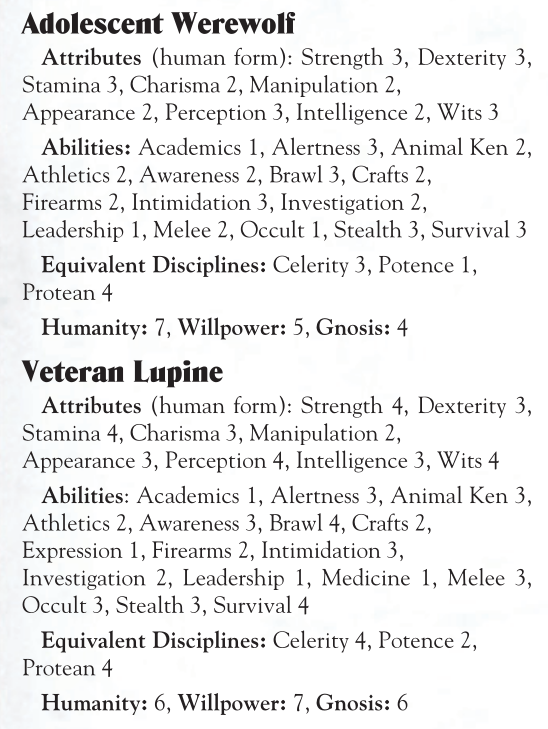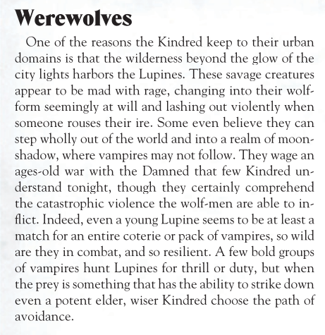 >там нет этого "бойся гару! это пиздец и смерть, пиши завещание на сира". А это что? >Don’t go into the woods unless you’ve made peace with your maker. >even a young Lupine seems to be at least a match for an entire coterie or pack of vampires >Vampires speak fearfully of the Lupines’ capacities for violence. Even the most hardened Brujah and the deadliest Assamite give the werewolves a wide berth >Even elders wisely fear the viciousness of the wolf-men, as much for their near-indestructibility as their ability to inflict carnage.