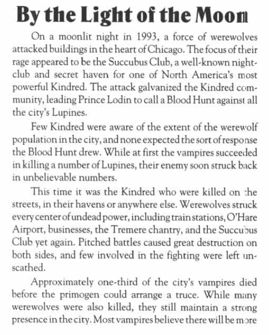 >>1646367 >Но они их не боятся. Оборотни для вампиров-нормисов просто дикая хуйня, которую без надобности лучше не трогать, а для особо преисполнившихся в своем поколении оборотни - любимая дичь. То-то вампиры из города нос показать боятся. Их боялись во все времена. (пик 1 и 2) >И сами оборотни не ходят в очистительные рейды по вампирским притонам. Почем же, раз они настолько тех нагибают? Оборотни не любят города. Там Вивер и мерзкая городская умбра. Да и вампиров хер найдешь - они хорошо прячутся. Хотя если сильно доебут, то ходят в рейды. В Чикаго между 1 и 2 редакцией был налет оборотней - треть сородичей вырезали.(пик 3)