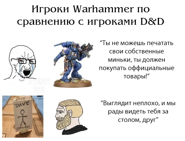 >>1646041 >скинчик Проблема не в этом, а в том, что даже если минотавр будет файтером 20 уровня, у этого дма на воротах будут стоять стражники 40го с фитами на попущение минотавров и иммун к страху, а 40лвльные коммонеры будут харкать ему в лицо ворпальными харчками разрушения на 10д10 урона кислотой и провожать издевательским улюлюканьем на 5д12 психикой без спасброска. Так-то мы уже считали в треде, что базовый файтер 1 лвла по пидëрке таки попускает нескольких стражников со стандартными статблоками, так что, имхо, таки должен огнем и мечом усмирять мудаков хоть некоторую опаску неписям внушать. Даже вроде какой-то анон автобатлер написал, моë увожение. Про что-то типа 3.5/ПФ — сильно зависит от настройки стражников, но если ДМ нормальный и они там не по Сигилу разгуливают— ПЦ тоже не должен быть первым чмом на деревне.