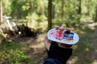 Примерно в середине выкатки мы устроили привал возле живописного места у речки и решили пожечь костер и покушоц сарделек. Ну, рецпт примерно такой усредненный, ибо вариантов масса. Берутся сардельки, они не варятся, варить - это не про меня. Они бросаются прямо в костёр и начинают жариться. Сверху это все засыпается хворостом, добавляется ЗОЛЫ для вязкости и жарится до дыма и угольной корочки. После этого они протыкаются палочкой, достаются из костра и остужаются на ветру. После этого я начинаю их есть, приговаривая ух бля. При этом у меня на лбу аж пот выступает. Иногда любезно предлагаю другу, но он отказывается. Стоит ли говорить, что пердежь после этого такой, что резина от седла отклеивается.