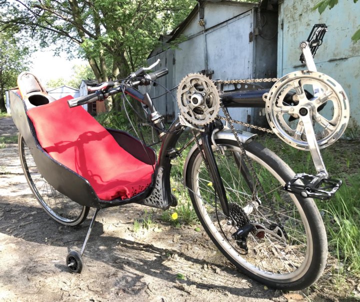 Сабж собсно в названии. Треад для обсуждения конструкций, покупки, особенностей вождения разных типов итд. Давно хотел купить, в прошлом году созрел и купил полусамодельный девайс (первая фотка), пришлось немного перепилить трансмиссию и отформовать кресло из пенопласта и стеклоткани. На асфальтовых дорогах девайс просто божественен, разгоняется км до 50, несмотря на вес под 30 кг, трансмиссия сейчас имеет недостаточное передаточное число чтобы разогнать еще. Разогнанный летит по дороге почти не теряя скорость, отличие от велика в плане лобового сопротивления колоссальное. Но на большой кочке\ямке легко можно потерять управление и завалиться на бок, а обзор дороги куда хуже чем на велике. При сходе на грунтовку (тем более влажную) мой девайс превращается в тыкву. Тряска передается на спину, не привстать на педалях. Запас равновесия гораздо меньше, поскольку отклонить можно только верх туловища и отработать отклонение рулем. При соскальзывании колеса в сторону из-за низкого центра тяжести девайс приобретает наклон гораздо больше чем велосипед. Но это мой, лоурейсер с очень низким ЦТ. Возможно с высоким расположением кресла, высокой спинкой и нормальной подвеской по грунту значительно веселее ходить. В конце концов два американца от москвы до китая проехали в нулевых годах по лютейшим говнам.