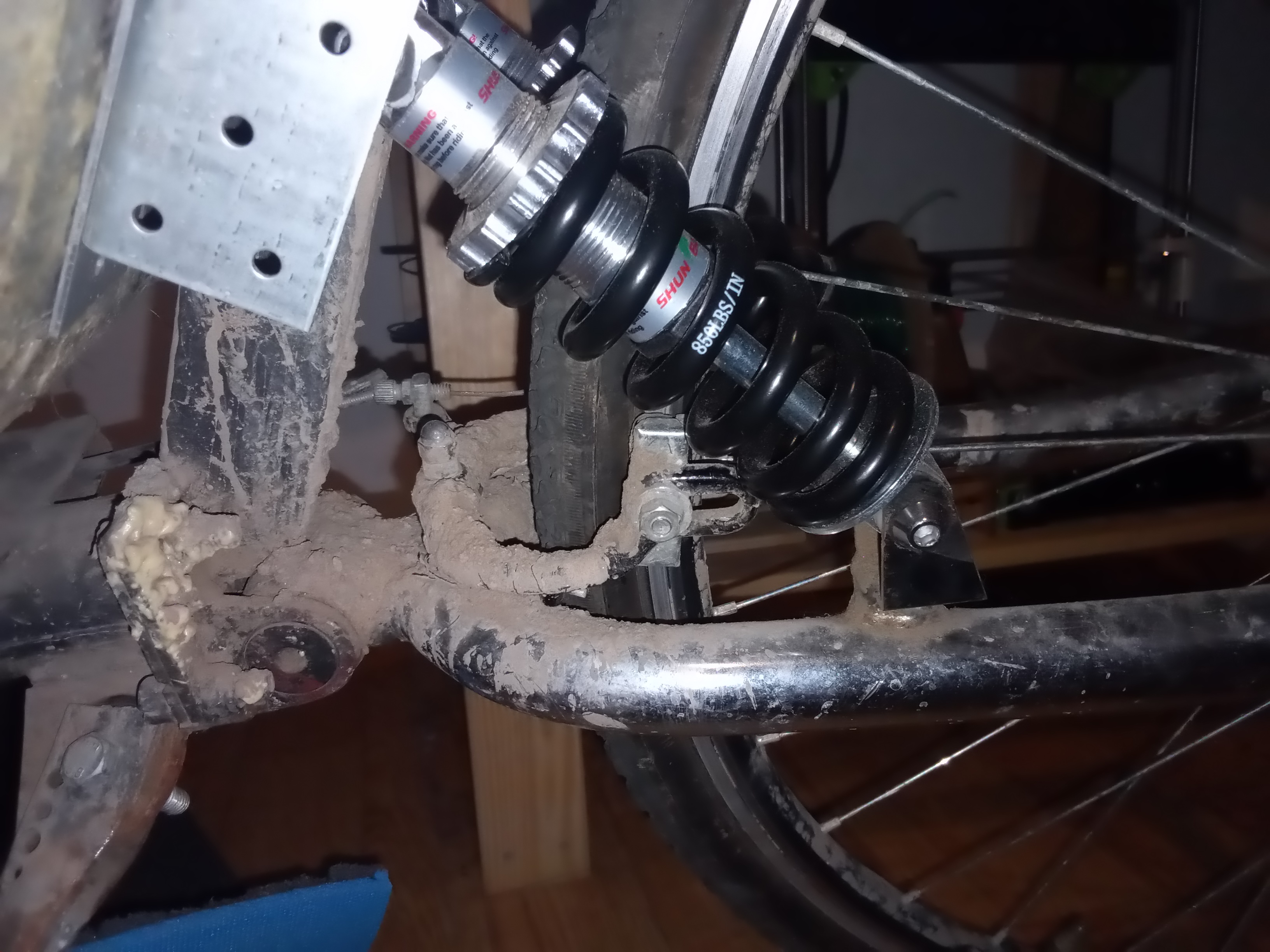 Наиболее всратые узлы наркосипеда, особо радует вырез в раме под шарнир тяги. Я бы просто изготовил два кастомных выноса, что дало бы возможность использовать стандартные вилки. Также шарниры на разных расстояниях от осей, что даёт некоторыйээое уменьшение угла поворота колеса.