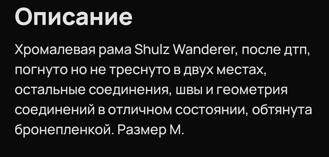 >>1632503 Вот так и выглядит велик буйного щизофреника. Видимо препаратами подлечился и поэтому решил продать когда осознал что натворил. И откудова только у ебанутых деньги берутся?