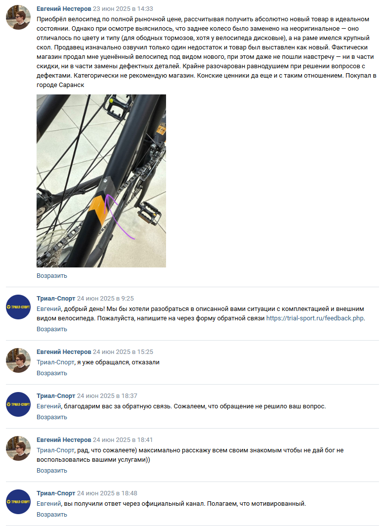 Лол. То ли дело триал: вел продали с каким-то китайским хуйпойми колесом, оригинальное спиздили, на жалобу через сайт ответили посылом нахуй, в вк тоже послали нахуй. Охуительный сервис. Давай, хуярь по методичке, пиздони что надо было самому проверить или ещё что там.