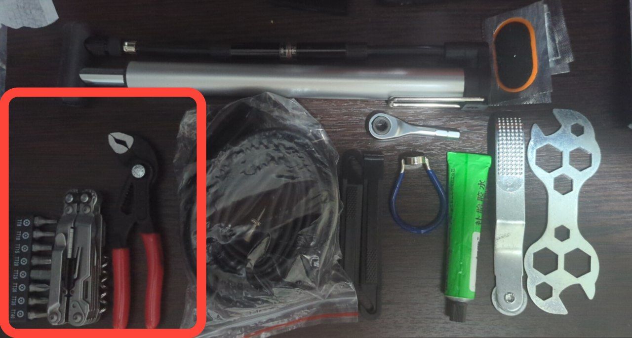 Мой набор - выжимка отдельная, шестигранники отдельные, латки с клеем, спиртовые салфетки, мультитул обычный, монтажки, которые еще могут превращаться в узкогубцы, насос. Соответственно нужно бы камеру прикупить, замок для цепи, перчатки, немножко стяжек.