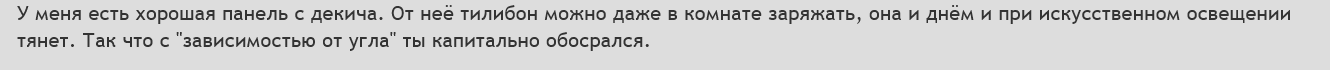 >>1607837 По сути перечитывай >>1607813 >>1607833 >как ты сейчас обосрался Ты меня типа подловить пытаешься на чём-то своём гуманитарном? Очень жалко выглядит. >Или ещё лучше хотя бы купи самую дешёвую панель с алика У меня есть хорошая панель с декича. От неё тилибон можно даже в комнате заряжать, она и днём и при искусственном освещении тянет. Так что с "зависимостью от угла" ты капитально обосрался.