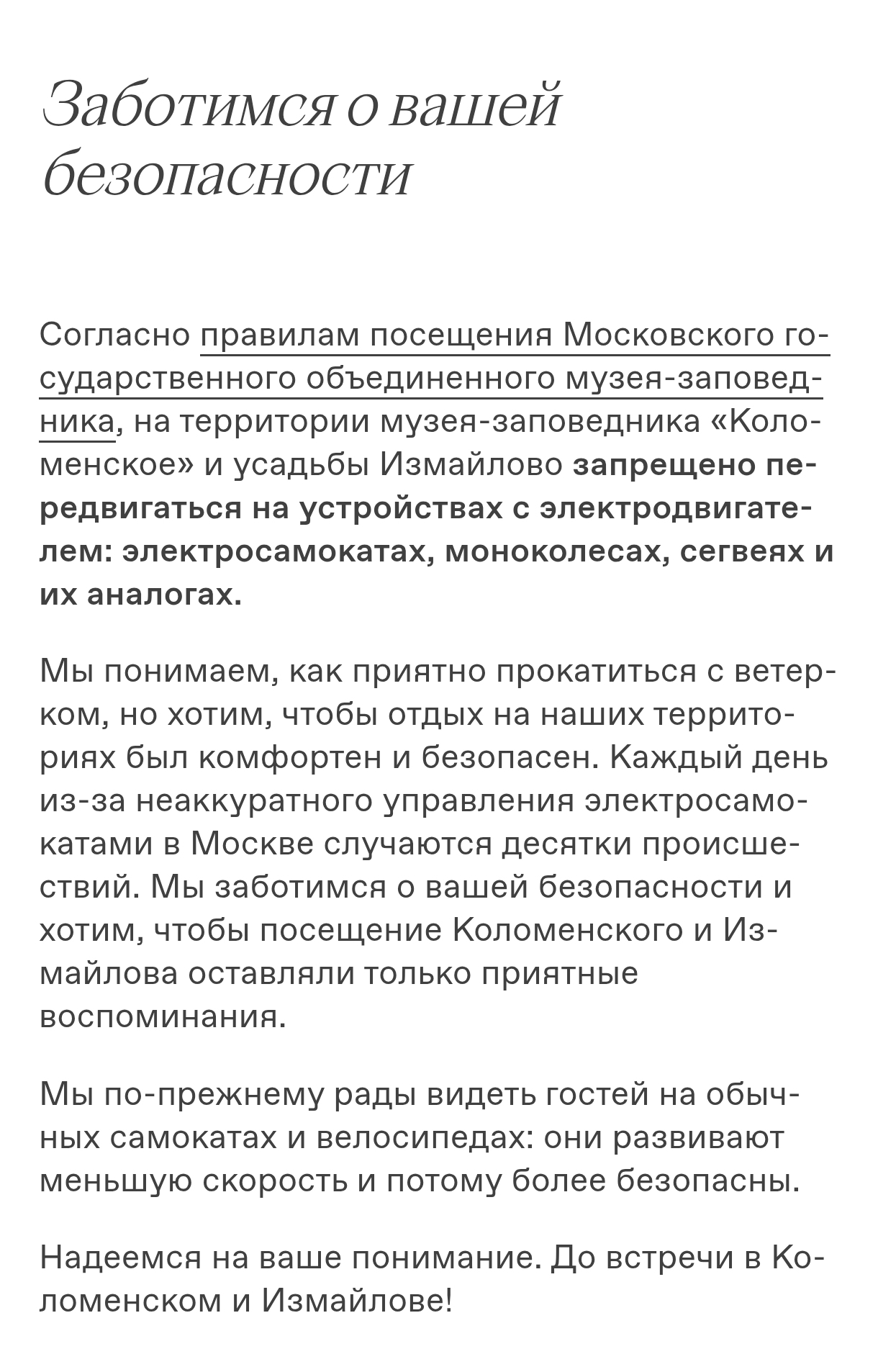 Если в Царицыно тебя развернут с любым транспортом будь то велосипед или даже аналоговый самокат, то в Коломенском решили отыграться только на электросамокатчиках.