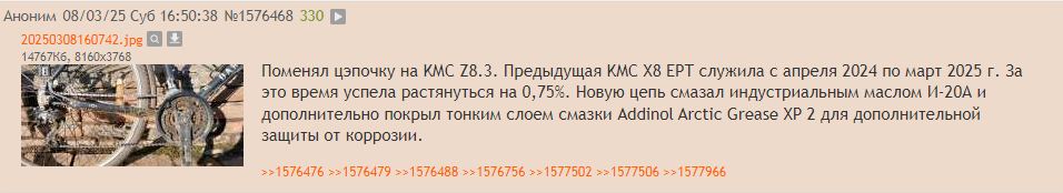 >>1625056 >>1625075 >>1625096 Прикольная штука. Не знал что есть такие калькуляторы. Нашел один, правда для мотоциклов. Но я знаю сколько звеньев нужно прибавить для правильного результата. Получилось 116 звеньев нужно, не 118.