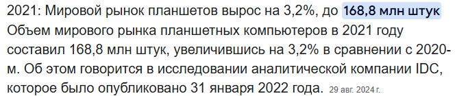 А тем временем реальность даёт по ебалу динозаврам.... Впериод сянваря помарт вРоссии было продано 732 тысяч планшетов наобщую сумму 14,7млрдрублей. Это рекордный показатель первого квартала начиная с2020 года. Посравнению саналогичным периодом 2024 года продажи планшетов выросли на6% вштуках ина5% вденьгах.