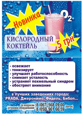 Продажа кислородных коктейлей Аноним Чтв 12 Июл 2012 12:28:23 №360272 1342081703913.jpg (66Кб, 345x479) Показана уменьшенная копия, оригинал по клику.