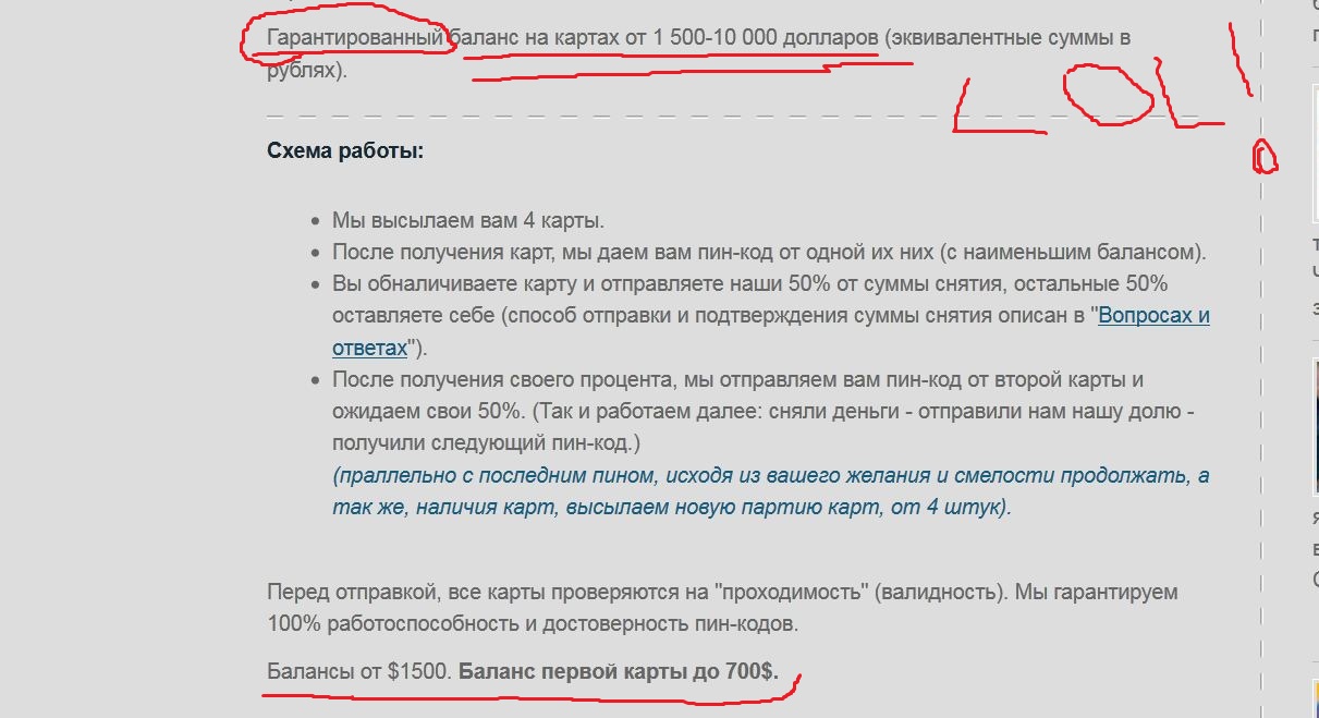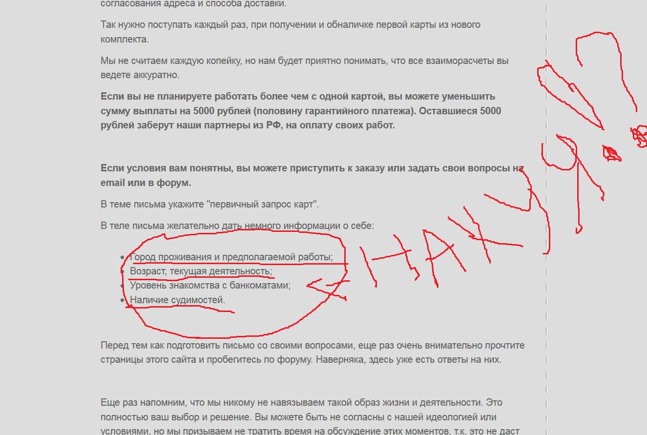 2. Вы реально можете заработать с нами. Мы платим 2500 рублей за каждого привлеченного человека. Это совсем не значит, что нужно вовлекать родных или друзей. Если вы общаетесь в сети, вы можете где-то поддержать разговор о руобнал или развернуть «травлю» очередного теоретика по кардингу. Завлечь через личную беседу в форумах или email, или еще как-то. Доказательством того, что человек от вас, будет знание его email адреса и копия переписки с ним. Именно ваше письмо ему, может помочь сделать выбор в пользу работы с нами. А после этого, у него будет тот же выбор, что и у вас. Совсем не нужно расхваливать нас, это даже подозрительно. Лучше вести себя немногословно, нейтрально. Говорить, что «с нами можно заработать» и все. Проверить, сделал ли он в оплату и «вступил ли в игру» вы всегда сможете связавшись с ним. Так что, здесь мы вас не обманем.