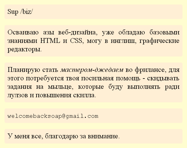 1)Поэтому буду ввозить на физ. лицо, для начала 7-10 позиций в месяц. Если взлетит, то будем совместно оплачивать аренду и прочее. Для начала я помогу ему приобрести клиентов в интернете, то есть начну пиарить через интернет. Он в этом просто 0, фирма работает давно. Я хочу показать ему, что правильная интернет реклама работает. Так как работать я привык, то для начала начну рекламить на свои деньги, я готов пролететь- это единственный шанс в моей жизни поэтому похуй, тян нет, родители даже готовы помочь, они будут рады моей работе. Раньше работал на дядьку кстати, его фирма взлетела, я ушел по причине того, что учеба заняла много времени, теперь времени гораздо больше, пишу на бумаге и тхт план, ложусь спать в 3-4 часа утра, да устаю, но мне это нравится. При этом буду работать(работа в офисе, то есть время для раскрутки будет, чахнуть не собираюсь). Не пью, не курю и вообще нетребовательный. То есть я вроде бы и человек, а вроде бы и "животное." По крайней мере сам я оцениваю себя так. Одно время работал на извоз абсолютно бесплатно для друзей. Но как вы понимаете ко мне стал "тянуться народ", так сказать использовать меня,да, именно использовать, да, я все понимал. То есть ко мне стали уже подходить друзья друзей и вышла полная хуйня, примерно через год я просто сказал, что не занимаюсь этим, аккуратно сбросил груз с плеч. Занимался я тем, что решал проблемы с телефонами, патчи, прошивка, обновление, на некоторых моделях прошивал звук и есть такие модели, на которых действительно звуковые драйвера давали хороший прирост, пример телефон w610, тогда все люди сидели примерно на таких модельках, было это около 3-4 лет назад. Минусов в том, что я делал много, но есть и хороший плюс- я обрел опыт, я стал шкурой, которая испытала некие проблемы, стал больше понимать людей, стал более тактичен, уже вижу и детектирую нужных мне людей, друзей и просто хитрых лисов. И да, я был осознанно лопухом, я все понимал, но просто не мог отказывать людям и брать деньги(думаю много людей меня поймут."Ну Васек, ну друзья же, хули ты, помоги, братан!" ). В итоге примерно из всех людей 10-15% из них дали выхлоп в решении моих проблем, пару из них помогло решить вопросы с отморозками, которые как обычно просто доебались до нас, то есть до нашей компании(компания- в смысле компания друзей, а не бизнес и крыша. Нет, это просто было быдло).