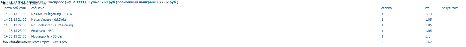 Empire vs NTH 1.85 на Empire Как я и говорил вчера эмпаер играли сильно. Учитывая что поражение сегодня может означать для них то что они не выйдут в финал, они будут бороться до последнего. У НТХ же наоборот, всего одно поражение соу фар, поэтому у них есть буфер для проигрыша. Ставлю на эмпаер.