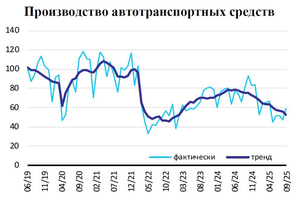 Первый с конца В этом году автопром по итогам 10 месяцев уверенно возглавляет антирейтинг по падению выпуска, пишет ЦСР. В целом в промышленности выпуск вырос на 1% в годовом выражении, а индекс производства автотранспортных средств, прицепов и полуприцепов сократилось на 22%. Причем в октябре спад приблизился к 40%, тогда как годом ранее отрасль росла более чем на 20%, приводит ЦСР данные Росстата. В производстве легковых автомобилей падение год к году составило 9,6%, до 537 тыс. единиц, с коммерческим транспортом, грузовиками и автобусами все гораздо хуже – там падение колеблется от 24% до 55%, и пока нет признаков оживления, констатирует ЦСР.