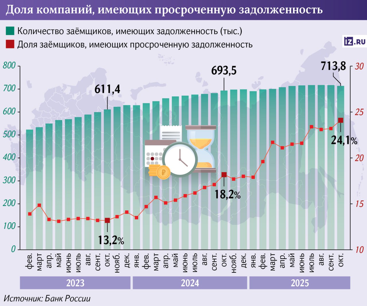 Инфляция также увеличивает все налоговые показатели и вместе с ними — номинальный объем недоимки и других видов задолженности, отмечает декан факультета налогов, аудита и бизнес-анализа Финансового университета при правительстве РФ Вадим Засько. На рост задолженности также влияет высокая ключевая ставка, которая в первой половине 2025-го держалась на уровне 21%, а после была снижена до 16,5%. Пени привязаны к ставке и растут вместе с ней, пояснила Гогаладзе. Поэтому при высокой ключевой даже небольшая просрочка превращается в серьезный штраф.
