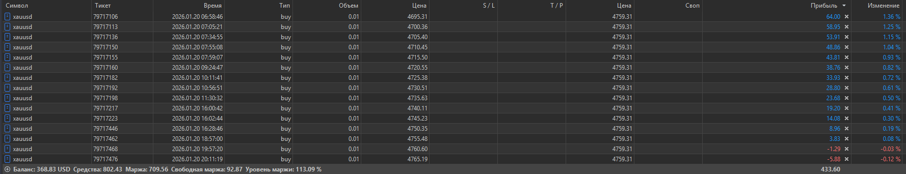 >>2418498 у меня нет скальпинга, у меня по сути что-то типо коробки дарваса. я начинаю набирать позиции сеткой на 1% от депозита, это по стоп лосу если все стопы стопы сработают, то сумма не превысит 1% пока не отклоняясь от стратегии я не разу не получил -1% стопы у меня собственно очень широкие вначале, при достижении первых целей идет перевод стопов в небольшой +, а затем уже пирамидинг с переводом позиции в небольшой + очень часто выбивает именно после перевода в безубыток или по небольшой прибыли в. Но раз в месяц получается собрать пирамиду в которой 20-30 открытий есть, тут уже происходит сбор большой прибыли. и это все идет по сути на минутном графике