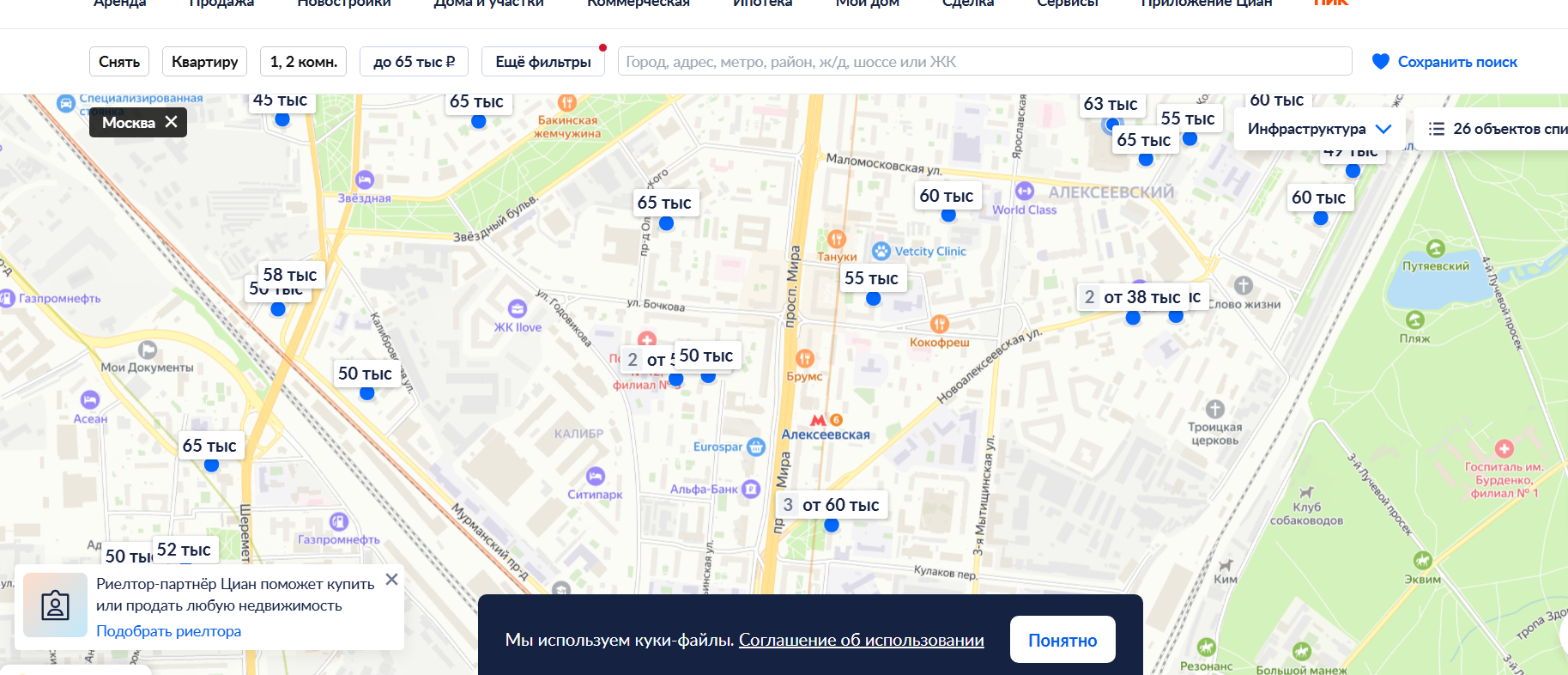 Чтоб понимать рынок, надо сохранить в браузере поисковые ссылки на выдачу картой на ЦИАНе для интересующих Вас районов с таким ограничением по цене, в которое попадают только несколько самых дешевых квартир, и периодически проверять количество таких квартир, сохраняя новые объявления на диск в html, так как ЦИАН удаляет старые сохранения на сайте.