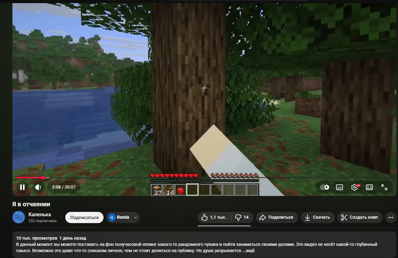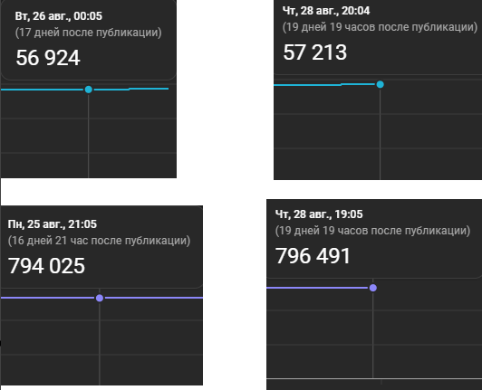 Итак небольшие итоги анону может будет полезно. 1й видос на канале собрал 75к просмотров за пару дней - был сделан за пол часа на коленке с пересказом англоязычного видоса + немнонго ресерча по теме. 2й видос с монтажем с закосом под конвея, тоже видос на спизженную тему - собрал 500 просмотров лол. 3й видос который был сделан сам посути сценарий вся хуйня, 3д реконструкция событий с анимацией и прочим говном на который ушел месяц с хуем. Собрал нихуя абсолютно. При том метрики удержания лайки комменты все хорошее, но хуй показов нет.