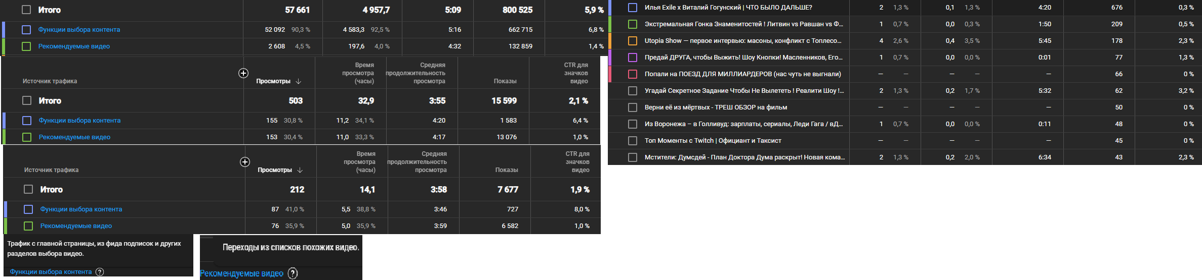 Ахуительные алгоритмы. 1й видос большая часть показов с главной. 2 и 3й видос сосут хуй, показы только в правой менюхе после просмотра видосов. Такие хиты как ЧБД и прочий шлак для вконтактодебилов ахуеть. Похуй короче на этот канал пошел другой делать.