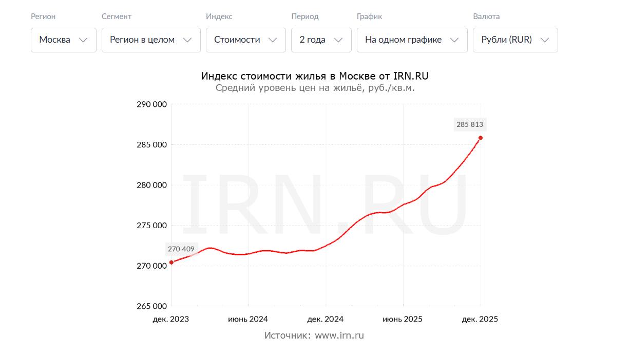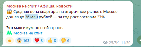 >Москва заняла первое место в рейтинге российских мегаполисов с наибольшим ростом стоимости квадратного метра на вторичном рынке. С начала года средняя цена «квадрата» в столице увеличилась на 24,5%, до ₽439,8 тысяч. Это в 3,5 раза больше официального уровня инфляции и где-то в 2,5 раза больше альтернативных расчетов.