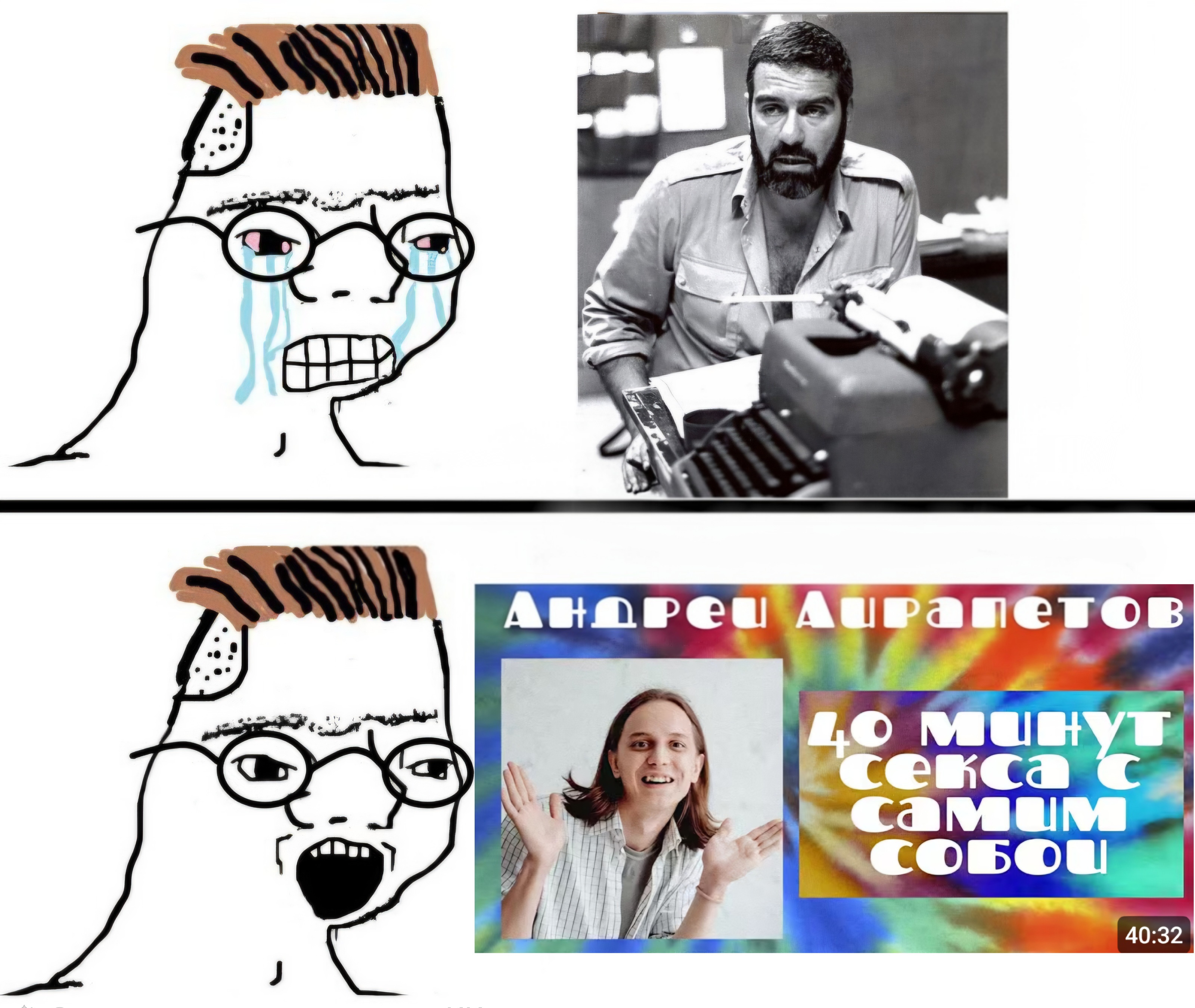 >>1035843 оп в свои 20 лет позажигал с нефорами и ролевиками, а потом состарился и во-первых захотел вспомнить молодость, а во-вторых захотел узнать, а что там было у наркоманов, бомжей и шпаны пока оп, завернувшись в занавеску, лапал в палатке жируху-эльфийку.