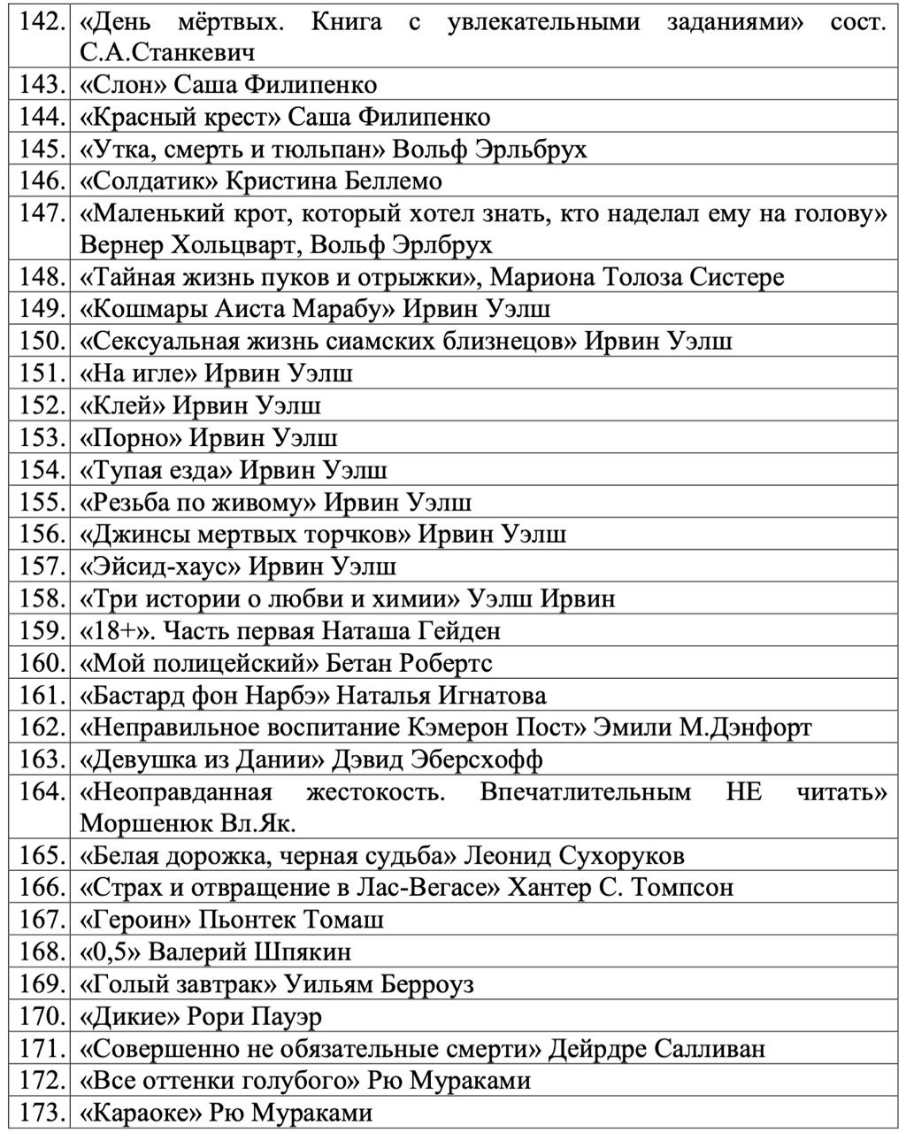 “День мертвых. Книга с увлекательными заданиями” сост. С.А.Станкевич “Слон” Саша Филипенко “Красный крест” Саша Филипенко “Утка, смерть и тюльпан” Вольф Эрльбрух “Солдатик” Кристина Беллемо “Маленький крот, который хотел знать, кто наделал ему на голову” Вернер Хольцварт, Вольф Эрлбрух “Тайная жизнь пуков и отрыжки”, Мариона Толоза Систере “Кошмары Аиста Марабу” Ирвин Уэлш “Сексуальная жизнь сиамских близнецов” Ирвин Уэлш “На игле” Ирвин Уэлш “Клей” Ирвин Уэлш “Порно” Ирвин Уэлш “Тупая езда” Ирвин Уэлш “Резьба по живому” Ирвин Уэлш “Джинсы мертвых торчков” Ирвин Уэлш “Эйсид-хаус” Ирвин Уэлш “Три истории о любви и химии” Уэлш Ирвин “18+”. Часть первая Наташа Гейден “Мой полицейский” Бетан Робертс “Бастард фон Нарбэ” Наталья Игнатова “Неправильное воспитание Кэмерон Пост” Эмили М.Дэнфорт “Девушка из Дании” Дэвид Эберсхофф “Неоправданная жестокость. Впечатлительным НЕ читать” Моршенюк Вл.Як. “Белая дорожка, черная судьба” Леонид Сухоруков “Страх и отвращение в Лас-Вегасе” Хантер С. Томпсон “Героин” Пьонтек Томаш “0,5” Валерий Шпякин “Голый завтрак” Уильям Берроуз “Дикие” Рори Пауэр “Совершенно не обязательные смерти” Дейрдре Салливан “Все оттенки голубого” Рю Мураками “Караоке” Рю Мураками