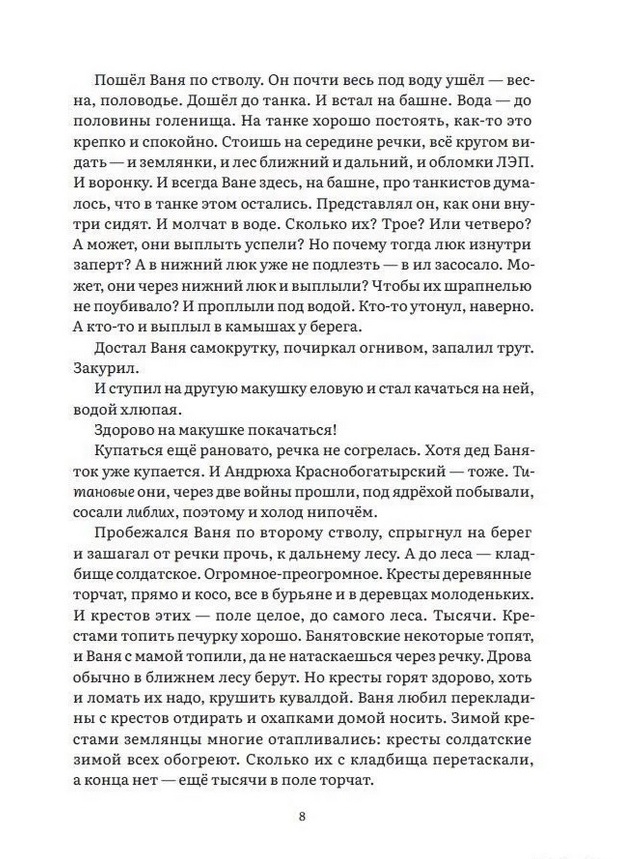 >>1027440 Узнается моментально: «В середине: “За Русский мир на смертный бой летит стальная эска-а-дрилья!!” – со всей мочи пропел бухой Устин и вдруг всхлипнул так, что все пацаны смертельно затосковали, словно оказались на похоронах старого школьного друга. В конце: Толян брел наугад по осеннему лесу. Обсосанные хмарью деревья толпились, словно скелеты великанов. Небо набухало. Вдруг нога подфутболила что-то живое в пожухлой траве: еж! Толян присел на корточки, взял в руки колючий клубок. И сразу печаль упала на него с серого неба. “Я тоже еж, – подумал он. – Только иглы свои порастерял. А новые ни хера не отрастают”. Он бережно опустил ежа в траву, встал. И вдруг как-то сразу, обвалисто и внезапно, ему захотелось до боли, до изжоги, до стона нутряного и до слез просраться в этом лесу и подтереться опавшими листьями. – Как во сне, бля… – прошептал он и рывком расстегнул свой старый дембельский ремень».