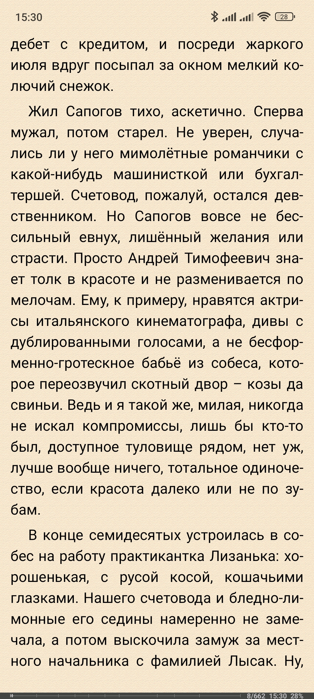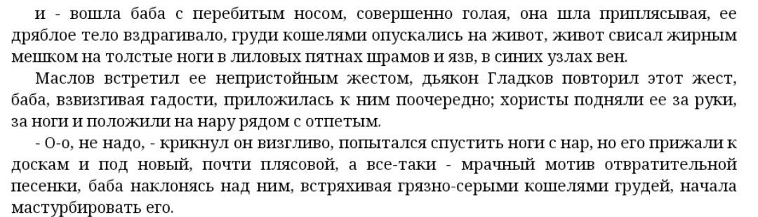 А у Сорокина понравились только Норма и Очередь, думаю 30 любовь Марины прочесть как-нибудь, но после первой страницы, где описывалось то как посрал её ебырь, как-то не хочется читать, учитывая что после Марины он написал Роман (не читал) и Сердца 4-х (которые не понравились совсем, просто набор гуру, как подметил выше приключенческий роман с элементами боевика, но стоит добавить что еще и без сюжета толком), думаю с Марины он и начнёт свою "шокирующую деятельность", как в Первом субботнике. Вообще, Сорокин как автор не понравился в принципе, слабый писатель на самом деле, хоть местами прикольный, да и родной будто уже, может в будущем Голубое сало как раз прочту ещё, но не скоро наверное. Хотя "Настя" отличный рассказ как раз того периода переосмысления творчества, после Сердец.