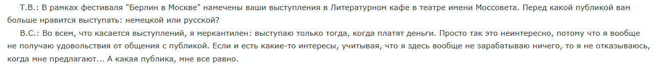Вот, кстати, выше писал уже про его интервью: "Интервью Татьяны Восковской с В.Г.С. ". Там где он про свою меркантильность. Это раз. А "два" прикрепляю к этому сообщению - ознакомьтесь со словами кумира. Он просто хочет "ту Россию которую мы (они) потеряли". И конечно же барчонком там быть. Ну, так все хотят... наверное. Но не крепостным ни разу. А ещё он сильно Берлин и гермаху зассаную нахваливал, аж до скрежета зубовного и соплей на усах. Наверное, всё таки, всё хорошее он через свою призму поносную пропускает. Ведь советская власть его ГОНБИЛА! Больше чем Маяковский. И вообще все поэты алкаши, а он культурно водочку пробирует, от случая к случаю. Понимать надо - это другое.